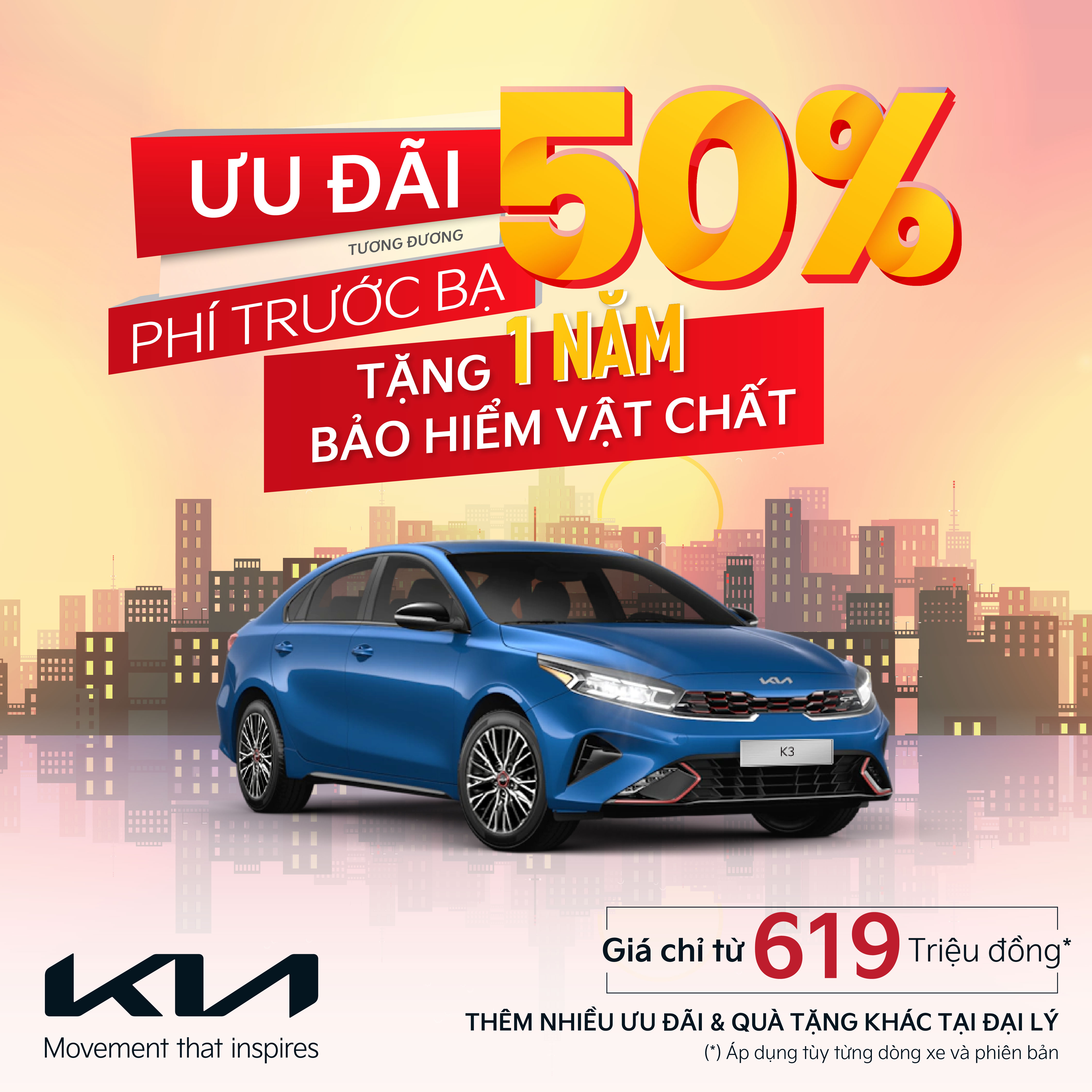 Từ 18/3/2023, Kia Việt Nam tăng thêm ưu đãi cho mẫu xe Kia K3 tổng giá trị tương đương 50% lệ phí trước bạ, tặng kèm bảo hiểm vật chất, và các ưu đãi hấp dẫn tại đại lý. Chương trình áp dụng tùy theo phiên bản.