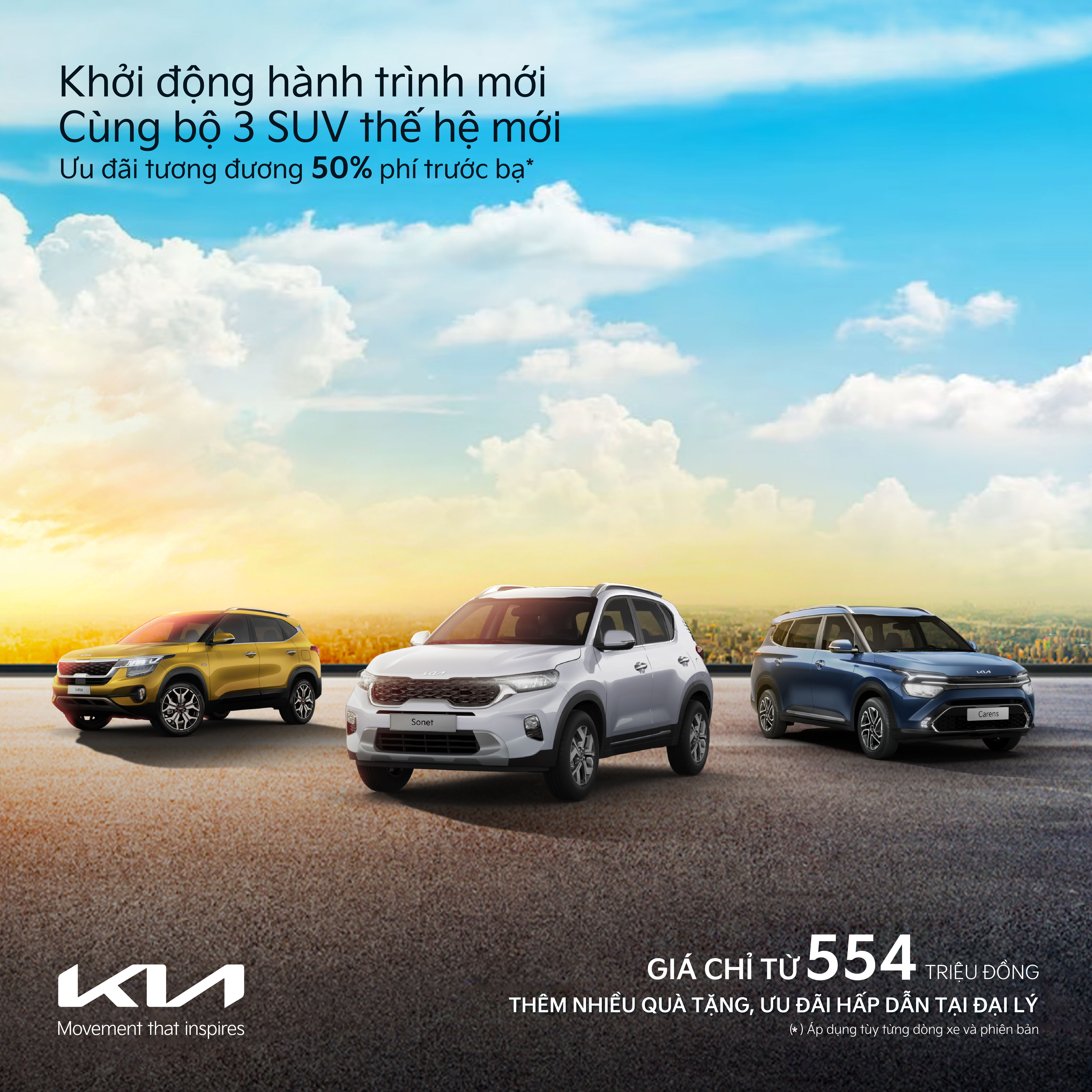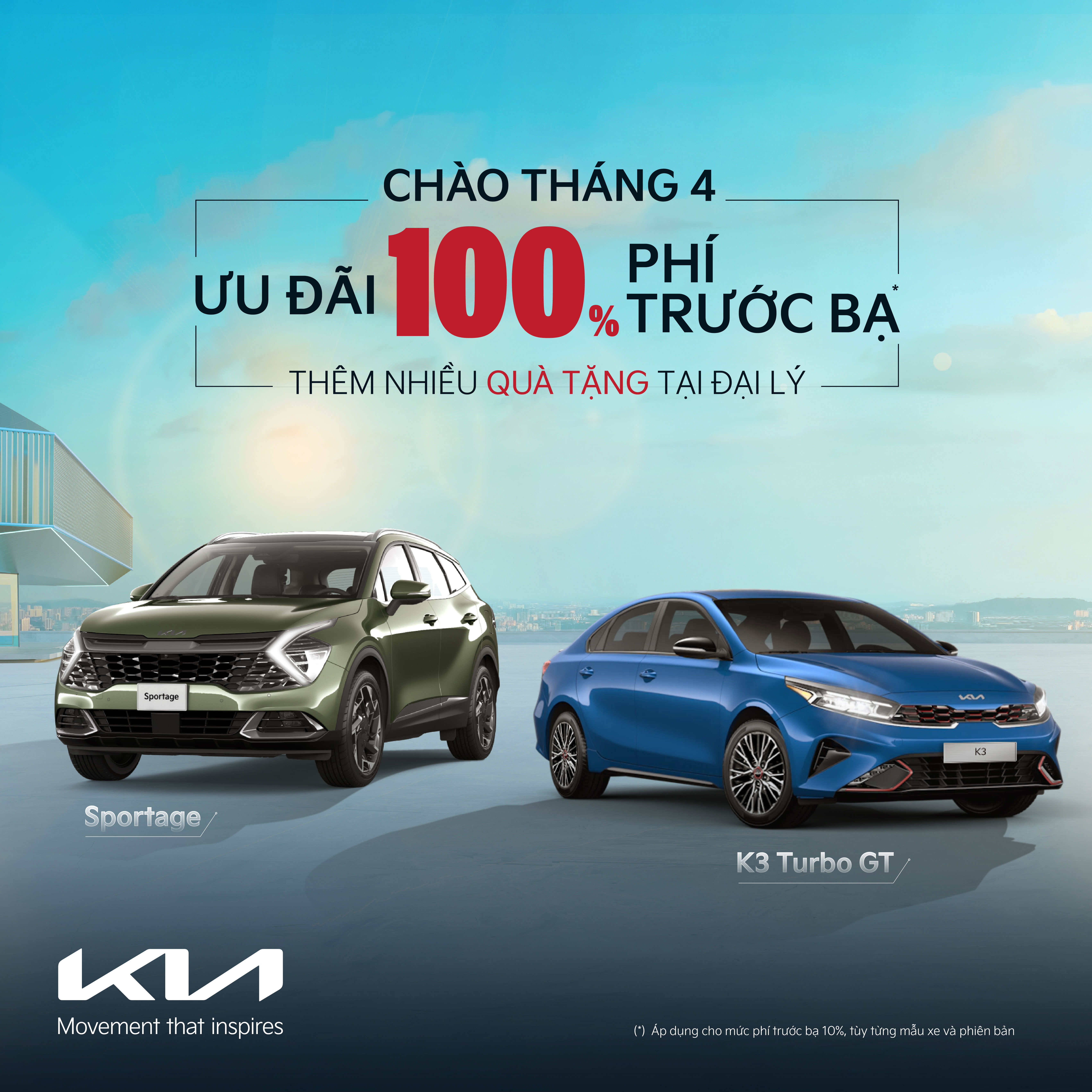 Từ 1/4/2023, Kia ưu đãi 100% phí trước bạ cho Kia K3, Kia Sportage cùng ưu đãi giá hấp dẫn lên đến 100 triệu đồng cho các mẫu xe khác, và thêm nhiều quà tặng tại Đại lý. Chương trình áp dụng tùy từng mẫu xe và phiên bản.