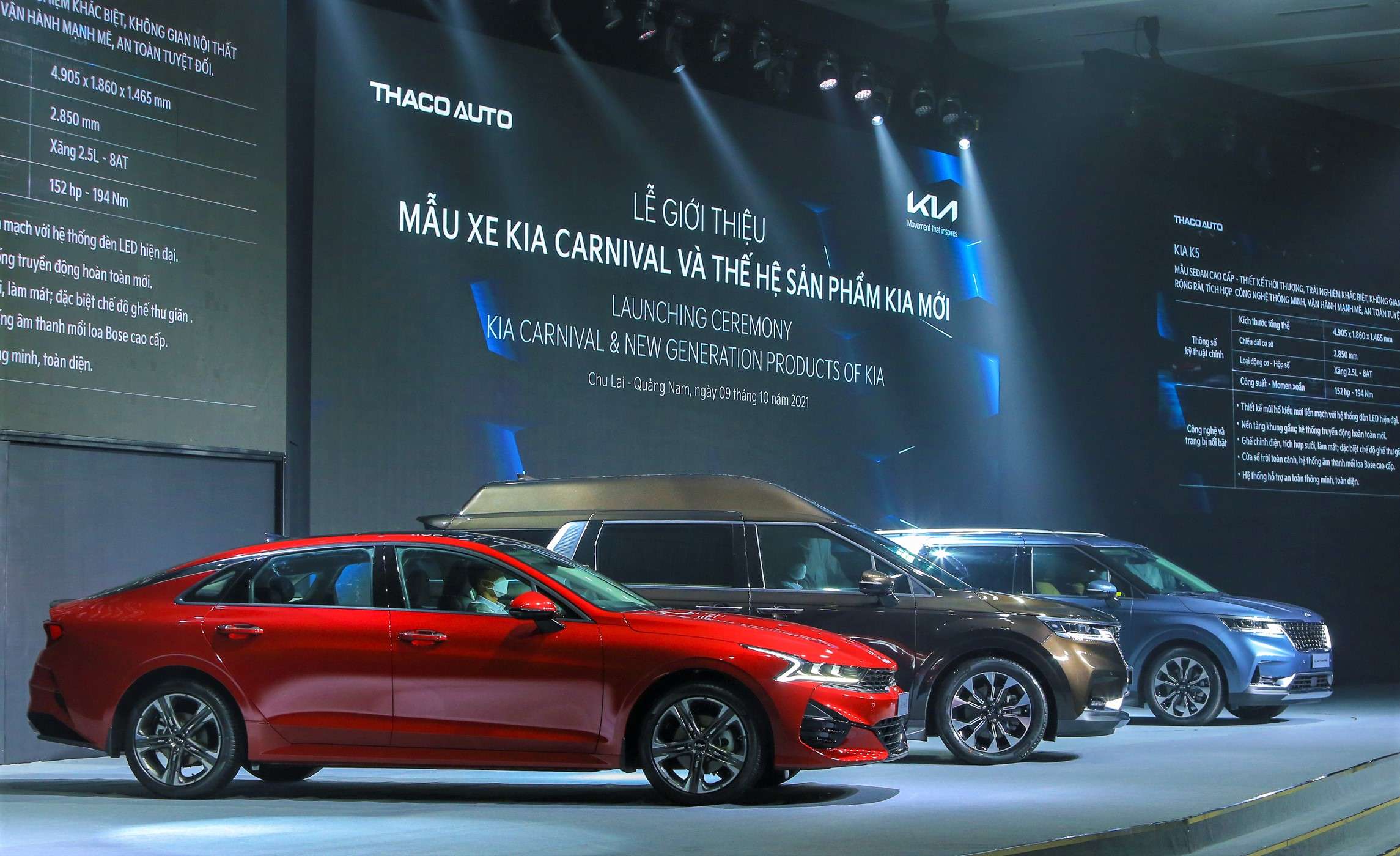Ngày 09/10/2021, THACO AUTO chính thức giới thiệu mẫu xe Kia Carnival - mẫu xe SUV đô thị có tính đa dụng, tiện nghi và sang trọng nhất ở thị trường Việt Nam, đồng thời giới thiệu thế hệ sản phẩm mới của thương hiệu KIA sẽ được giới thiệu tại Việt Nam trong thời gian tới.